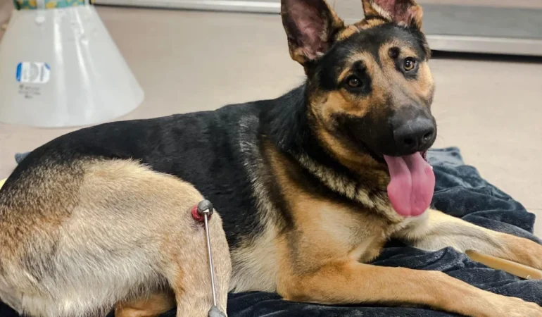 Thanks to the generosity of the Santa Barbara County Animal Care Foundation, more than $8,300 was covered to give me the medical care I desperately needed. I began a long period of crate rest as my leg tried to heal. Sadly, weeks later it became clear that my fracture wasn’t improving. I needed a second surgery, this time involving an external fixator to stabilize my leg after the break worsened. Life became even more difficult, especially for a young shepherd like me, as strict crate rest became my daily reality.